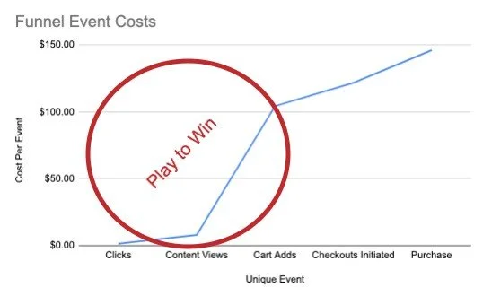 Here, the CUCA is $4.80, which is dwarfed by the relative AOV ($17.43). Instead, the largest relative increase in costs occurs from Initiate Checkout to Purchase events.